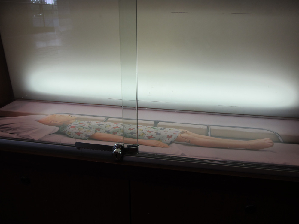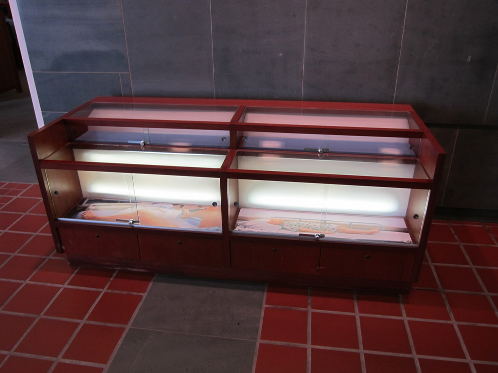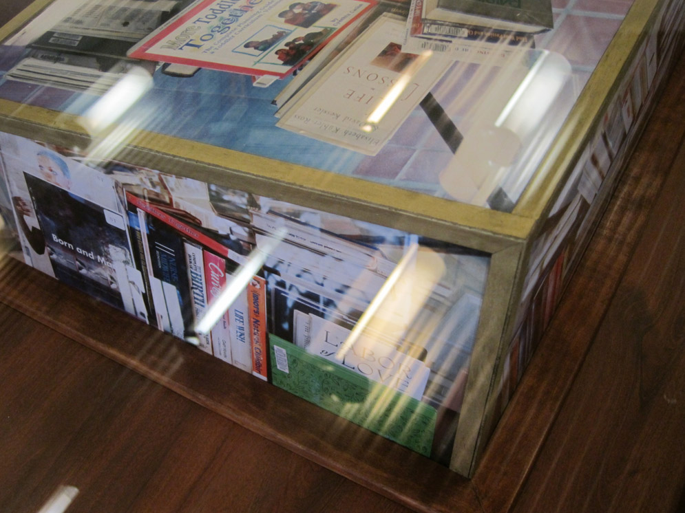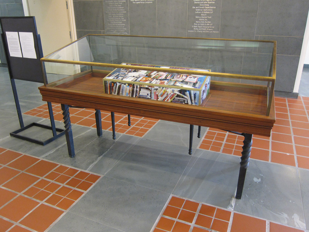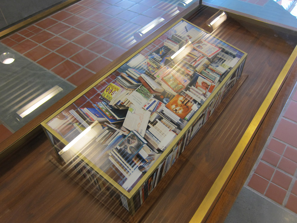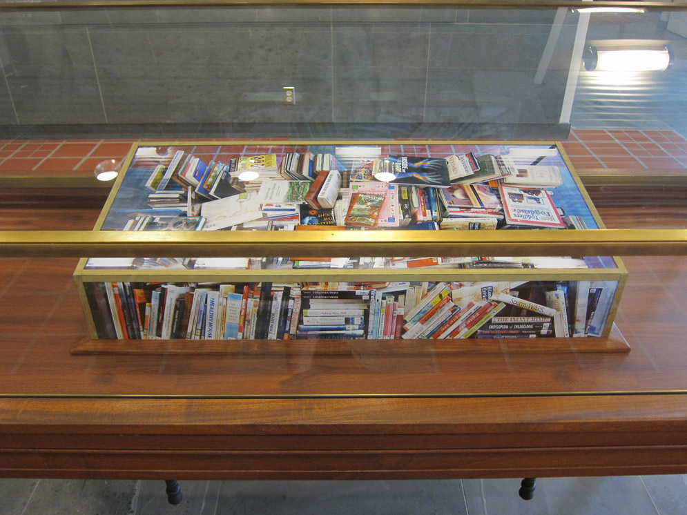 The Art & Music Department's Works Sited series is pleased to present "Paper Surrogate," a new display by Los Angeles artist Anthony Lepore. Using photographs, wood and plastic, Lepore has created a quarter-scaled replica of the display case housed within the original. This smaller edition contains a photographic snapshot of an arrangement of library books that either deal directly with the subjects of expectancy, birth and parenthood or have titles that invoke these themes despite their actual content.