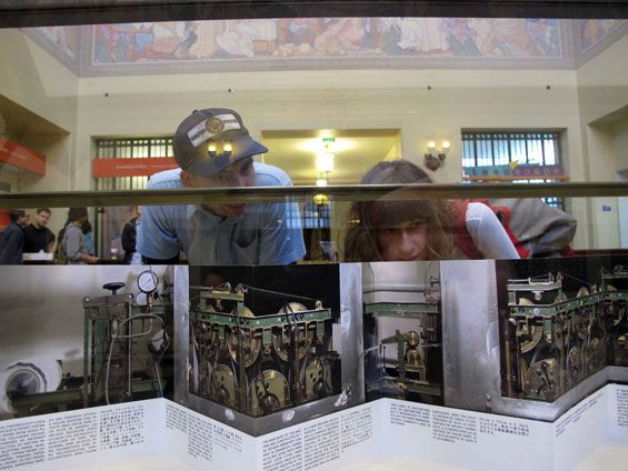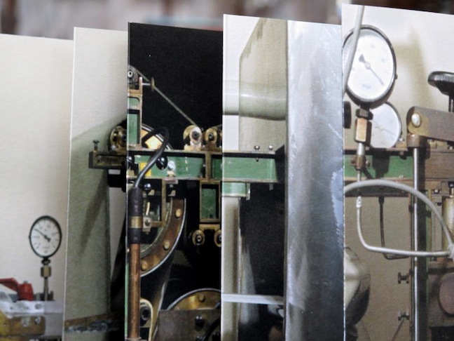 "Fourdrinier Machine Interlude" is a film consisting of one long tracking shot of a miniature Fourdrinier papermaking machine. The film runs slowly along the length of the elaborate industrial device and shows the transformation of raw wood pulp into rolls of paper. The even movement of the camera is accompanied by the voice of a young and earnest reader who shares a brief history of papermaking and the influence of the Fourdrinier Machine on this narrative. At moments, her voice hesitates and the occasional pronunciation slip (“deh-devdevihsing-divising”) makes us aware of the oral incongruities of language but perhaps more notably we are reminded that translating the past into seamless and objective history is a difficult and awkward, if not impossible, task. Whether at the root or chain end of the Fourdrinier, going upstream or downstream, the back and forth of gears and evolving paper evoke the social, cultural and technological advances that turn pulp into money, craft into industry and geography into history.