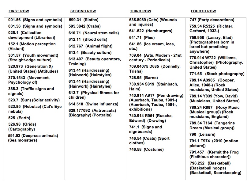 For the fourth installment of the ongoing Works Sited series, Los Angeles artist Brian Kennon presents a display in collaboration with LAPL cataloguer, Judith Strawser. Mining the Internet’s vast collection of digital imagery, Kennon compiles a diverse group of images ranging from the abstract to the representational. Adopting the rigid classification methods of the 16th edition of the Dewey Decimal system (the current standard employed by the LAPL) he has asked Strawser to treat each image as she might treat a book and assign an ‘appropriate’ Dewey decimal number in accordance with its subject. Once printed, the placement of each image within the case is determined by its numerical position within this system.