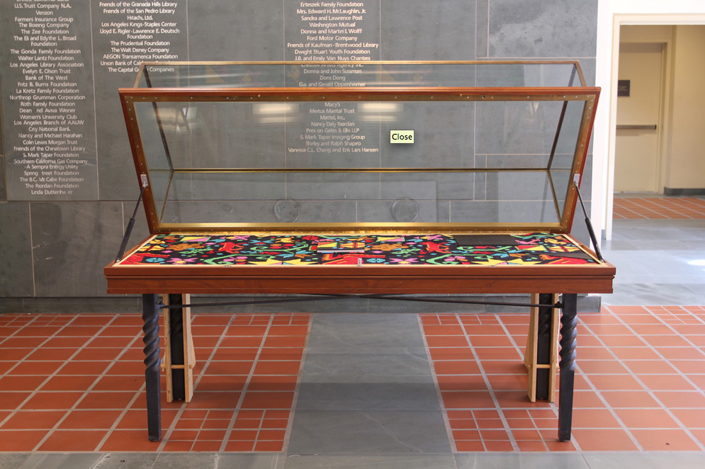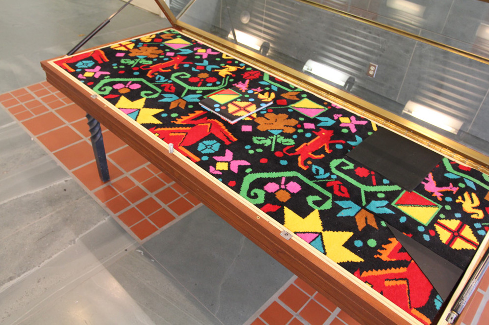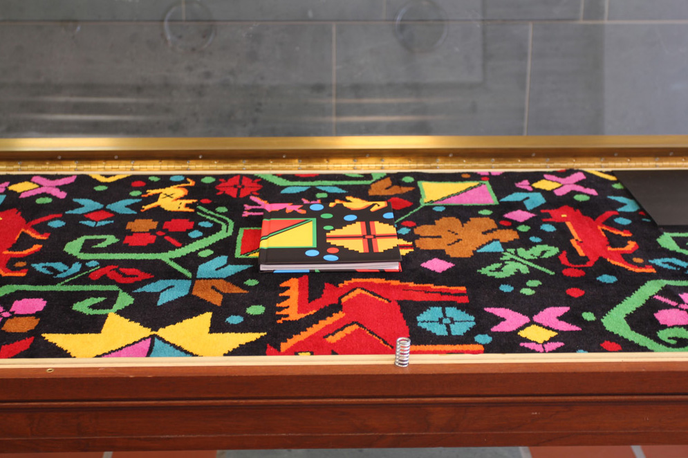 In the latest installment of the Art & Music Department's Works Sited series, Cayetano Ferrer presents a display that investigates the use of symbolism and ornamentation in public design. Creating a dialogue between Central library's historically significant carpet and the playful carpet of Las Vegas casino, 'Fiesta,' Ferrer suggests the possibility of iconographic significance in the latter, exploring the roles our collective experience and memory play in the production of symbolic meaning.