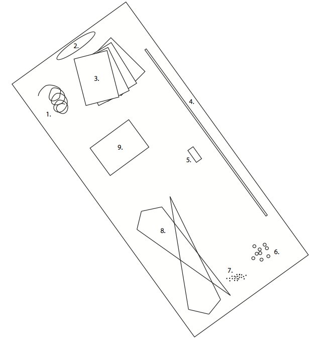 9. When Benoît-Marie Moriceau invited me to organize an exhibition in his studio the place was brand new and the paint had yet to be applied. Clément Rodzielski took advantage of this and asked us to leave a space the size of an A4 sheet of paper unpainted in the middle of one wall. Part of the idea behind the exhibition was to produce artworks from a distance thus Clément mailed us two pieces of geometrically shaped mirror- stickers to be installed within the A4 size space. To make sure we would install it correctly he sent it with a piece of cardboard (A4 sized) with cutout shapes corresponding to the correct placement of the mirrors. When Benoît-Marie sent me back the cardboard and the mirrors I did not know what to do with it, so I just ended up keeping it. - François Aubart