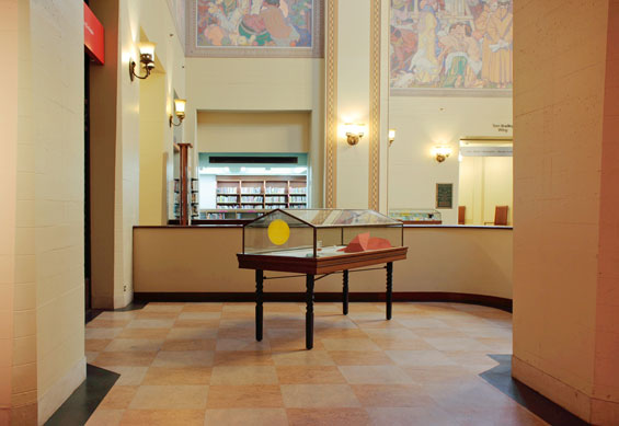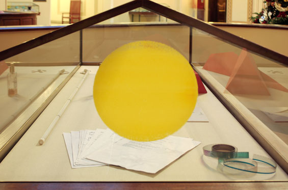 2. Sometime around April we hosted our second exhibition titled Y...as in yet, a group show which included the work of LA artist Mateo Tannatt. Mateo's work consisted of a portable radio sitting on the floor, a yellow dot screen printed on our window, and a sheet of paper with the words, "Today or/ tomorrow someone will arrive they will count to a thousand and/or until they want to stop this work may or may not be considered a performance music may or may not be heard this work can be realized by anyone". While installing we encountered a slight problem trying to print the yellow dot. Apparently a silk screen degrades from each use, and even more so if the screen is not handled and cleaned properly. Having very little experience in this matter we managed to do almost everything improperly, so that by the time we were on our third attempt the screen had lost its ability to print a full solid dot. On our fourth attempt we decided that the best solution would be to print the partial dot and paint the rest in, curatorial problem solving at its best. After a few more discussions on what to do and several adjustments later, we printed the dot and somehow it worked better than our previous attempts. We only had to spend a few minutes filling in some areas and voilà we had produced a complete yellow dot on the window of our space. Once the exhibition had concluded we contemplated what to do with Mateo's screen and squeegee. We were either going to hold onto it or discard it. Mateo's work in many ways existed as an event that lasted for the duration of this particular exhibition; what we had leftover was this partially degraded tool. We finally decided to keep it as a memory of our experience. It was the second show in our space and a great moment of triumph for us when the yellow dot appeared magically, almost complete. - Romain Chenais