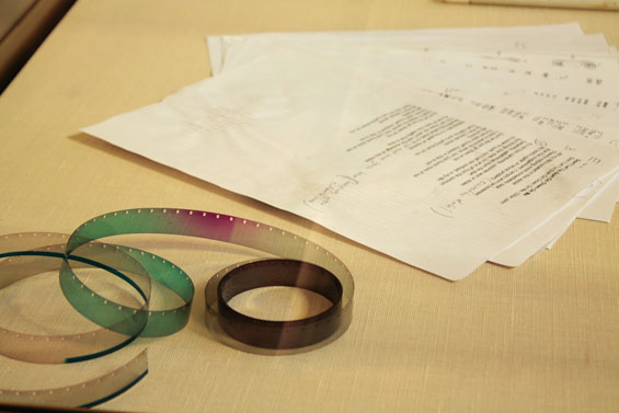 1. When preparing film for a new projection, I have to cut a part of it so that it loads properly into the projector. This becomes a film trim. This trim is usually discarded. The one you have here is the trim of a film showing the shoes of a girl named Dora in movement, dancing so to speak. By chance, while the film was being processed a pink to green gradation happened to appear on the trim. By chance, Dora's hair were the colors pink and green on the day we filmed her. I kept the film trim in memory of this. - Valentin Bouré