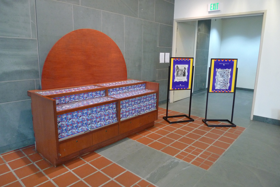 Mixing her own objects and textiles with images from the Art & Music department’s Picture Files – a collection of loose photographs and magazine clippings amassed by librarians prior to the advent of the Internet – Andrews creates a playful installation that investigates how the library references its contents. By strategically placing wood structures, textiles and images in and around the library’s existing display cases, sign stanchions and overall architectural composition, Andrews confronts conventional library display methods and directive strategies by leading viewers not only to the contents of these structures but to the very nature of the structures themselves. In essence Andrews enframes these frames, asking the viewer to think about how the library’s very efforts at directing visitors to its resources influence (and essentially limit) visitors’ ideas of what those resources may be.