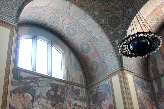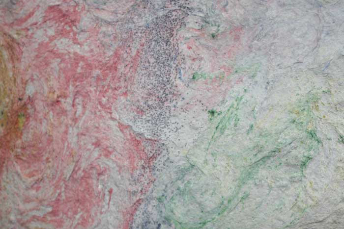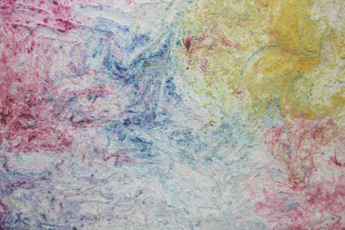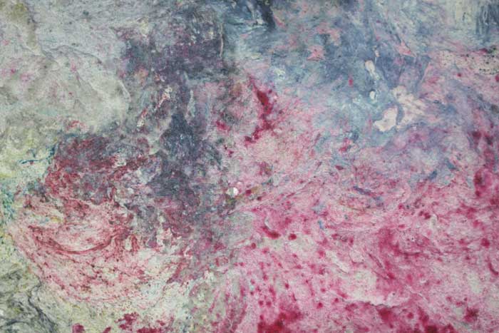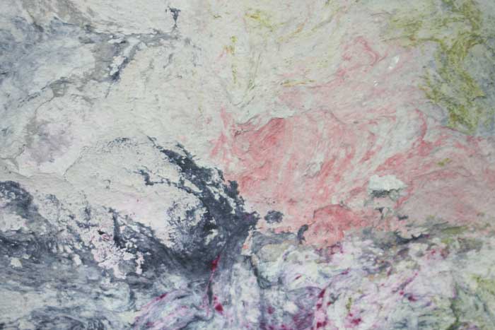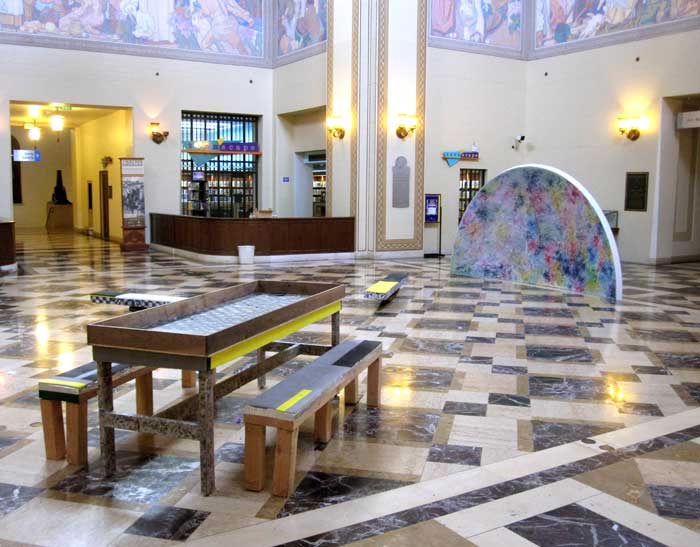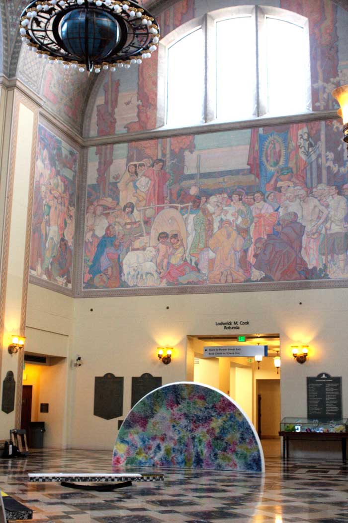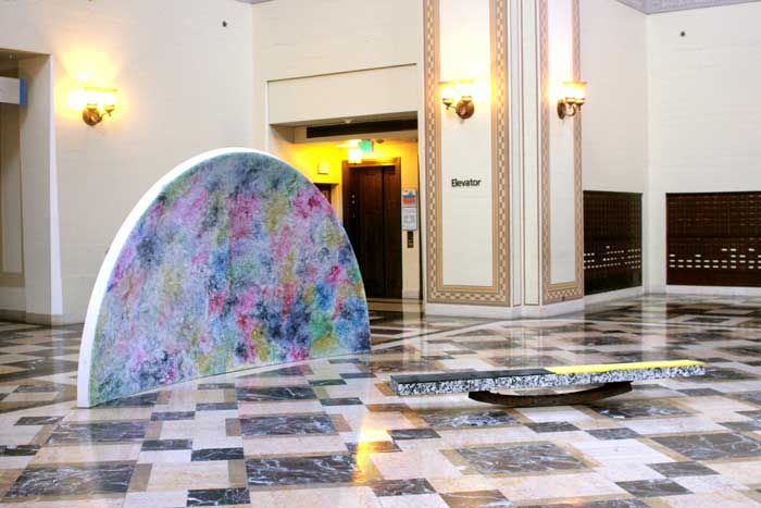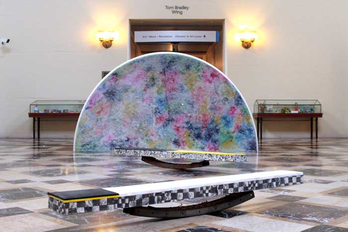 Echoing the library rotunda’s archways and domed ceiling, Labriola’s sculptural half-moons are covered in pigmented paper-mache surfaces that recall Impressionist paintings such as Monet’s Water Lilies. The work embeds the gestural marks of “painting” onto the bifurcated surface of a massive satellite dish that once functioned as a parabolic communication device providing Internet networks outside the US. Re-situating the dishes from the rooftop of a corporation to the interior of the library rotunda, they now maintain a more intimate mode of communication - by standing directly in front of the dish's center points and speaking into the concave form the viewer creates an echo chamber effect, initiating an awareness of one’s body in space.