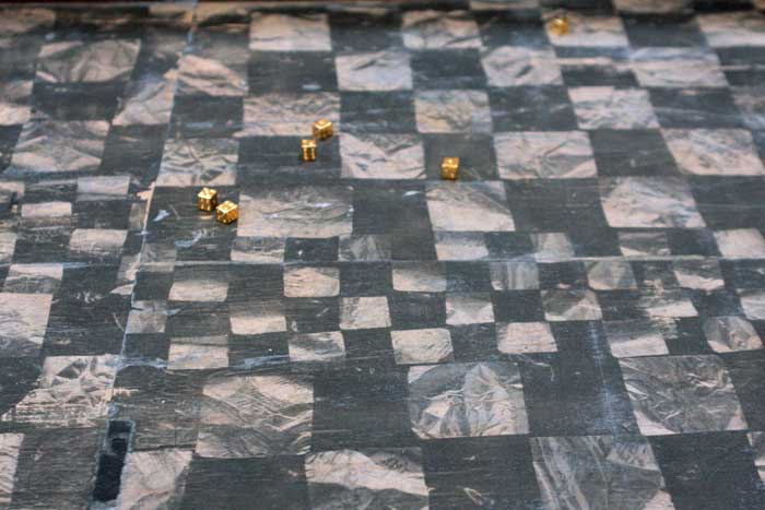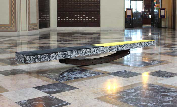 If the satellite dishes can be thought of as a split open I Ching, an object which creates a context for chance experiences to arise, Walsh’s accompanying craps table and benches also allow for the entry of possibility and chance encounters. Inviting viewers to roll gold dice atop its popcorn-imprinted surface (for Walsh popcorn embodies both performance and sculpture), the tables seek a surge of force and energy which is tied to indeterminacy. Two seesaw benches accompany the table and are upholstered in the same acoustical foam used to create soundproof chambers. These benches require two sitters to complete its form. If the stationary satellite dishes project the viewer's voice and reference invisible wavelengths, the foam acts as its material inverse, absorbing and containing sound but generating movement and physical activity.