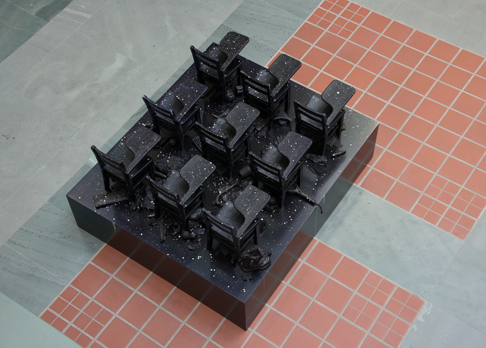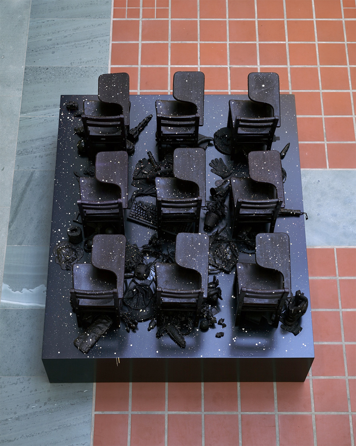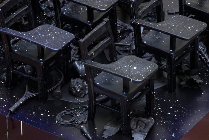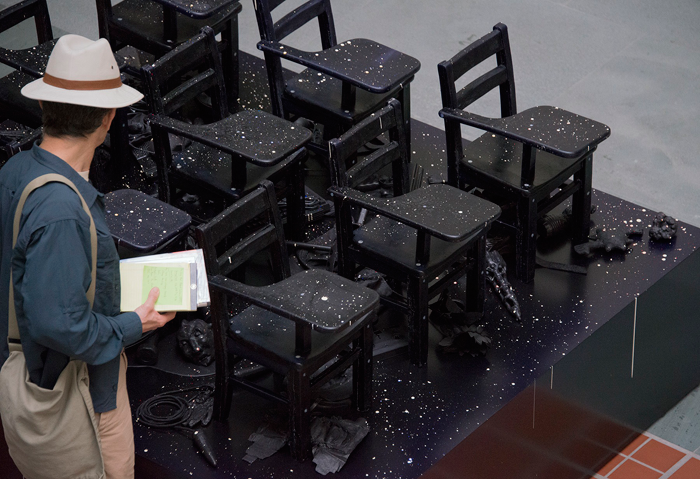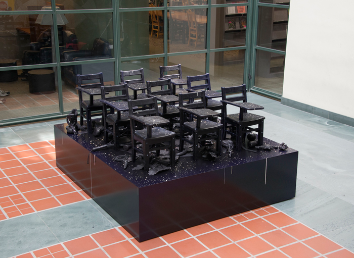 A planetarium is a situation in which a group of spectators assemble to sit in bucket seats, their vision trained upwards. They may or may not take notes. Gazing at a domed structure, the curvature of which mimics the curvature of the Earth, these spectators, who are people, encounter something situated curiously between information and entertainment. Prior to this encounter, a person who was likely selected for above-average vocal ability, has read a series of facts related to astronomy into a recording device. These facts, presented as the culmination of thousands of years of human inquiry, are played back while the spectators gaze at a "sky." Behind this "sky" is generally the real sky, perhaps hidden behind additional walls, floors, ceilings, or other structures. Occasionally, the stars themselves would be plainly visible, were it not for the fact that they were obscured by a ceiling, onto which more controlled, pedagogical "stars" are projected. These "stars" are comprised of a series of concealed lighting apparatuses controlled by a computer. A star is a celestial body which may or may not still be generating light. The light we perceive when we look at the stars is utterly unlike the light we perceive inside of a planetarium. It is, first and foremost, much older. Planetarium "stars" are beams of light which hit a surface in an artificially dark environment. Electricity, a small quantity of which may have been harvested from devices which convert light into energy, creates light, which passes through a substrate, and hits a surface. This light is perceived. A planetarium, then, necessarily entails a kind of bifurcated vision. We may conceive of two "views," which may not be experienced at the same time. ("Views" here functions as the indefinite participle, much like the "chews" of "peanut chews;" peanut chews as things which elicit chewing, are chewed, and remain chews prior to being chewed.) To sit outdoors and gaze into the night sky is to experience both depth and color of a wholly indeterminate nature. Wax holds color beneath its surface. Light, which generates heat, melts wax. The planetarium is also an animation. Animation is flat or extremely thin and comprised of a series of evolving forms or motifs. While animation may employ various disjunctive or nonlinear strategies, all animations entail change over time as it may be experienced from a fixed point. One way to animate a filmstrip is to lay it out on a long, glowing surface, and glide over it at a steady speed. Staring at a fixed point from a conveyor belt produces animation. An escalator is a vertically oriented conveyor belt which imposes a linear experience of space with optional agency (walking). Let's begin again. A planetarium is a group of people who look upwards and only upwards. These people sit in chairs. Below and around these chairs there may be the remnants of various human activities, for all intents and purposes unrelated to the educational transaction the planetarium provides. These people view up. Their view is that of the night sky, seen from a fixed point on the surface of the earth. Although each viewer might have a different vantage point relative to the ceiling of the planetarium, they do not see substantially different "stars," as one might, should she/he travel across the surface of the globe. The second view we concern ourselves with is that of the "stars," as it intersects that of the stars. Light travels up, hits a surface, and is reflected back down, to the point of the eyeball. The lie is finished at the point of perception.